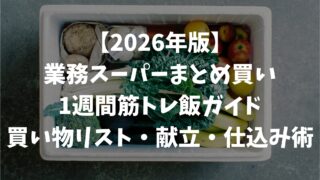 業務スーパーで1週間分の筋トレ飯をまとめ買いする方法を公開。予算2,500円の買い物リスト・月〜日の献立例・帰宅後30分の仕込み術まで、食費月2万円台を実現するコツをまとめました。